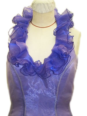 コンセプト首もとのレイのようにあしらったフリルと前から後ろに続く衿も、前のバランスをそのまま生かし、やはりリボンがレイのように軽やかさを出しました。使用生地ポリエステルシャンプレー オーガンジーポリエステルのサテン(土台布)オーダー期間約2ヶ月